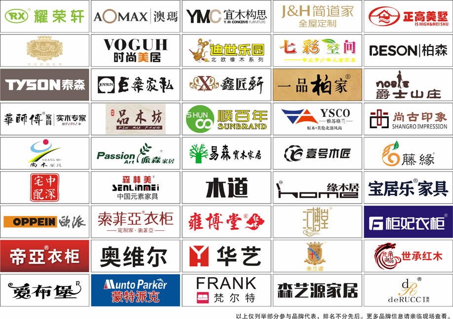 现代板式:红苹果、和风、艾纳菲、和风轩尼诗、I&D富运、澳玛、简道家、时尚美居、蒙特派克 现代板木:森盛、宜木构思、金富来奈菲 现代客厅:芝华仕、顾家、联邦米尼、左右、斯帝罗兰、格调、斯可馨、沃克、A家、利亚斯、诺亚国际、帝梵尼、宾诺 功能餐桌椅:博士有成 沙发床:苏格尔 软床:雅兰、慕思3D、舒达、斯林百兰、穗宝、大自然、翡洛奇、雅芳婷、金海马、百纳璐诗、诗维戴尔、海马莱思、丽星、尚御世家、美力格、塔拉蕾、菲尔、尺度生活、MBA、慕思苏斯、慕思凯奇、雅兰A-design 儿童套房:杰克丹尼、我的E家、耀荣轩、迪世乐园、七彩空间、梵尔特 地中海套房:正高美墅 简欧:美尔凯斯 欧式套房:宝居乐 实木套房:柏森、泰森、巨桑家私、鑫匠轩、爵士山庄、华师傅、品木坊、顺百年、雅苏格兰、尚古印象、尚木、派森、易森、一号木匠、藤缘、中深宅配、森林美、金富来·简式元素、一品柏家、木道、缘木居 红木:汇博堂、雍博堂、世承红木、森艺源 全屋定制:欧派、索菲亚、帝亚、华艺、米兰诺、奥维尔、柜妃、柏丽 鞋柜:金富来鞋柜 净水器:ECOWATER 窗帘:爱布堡