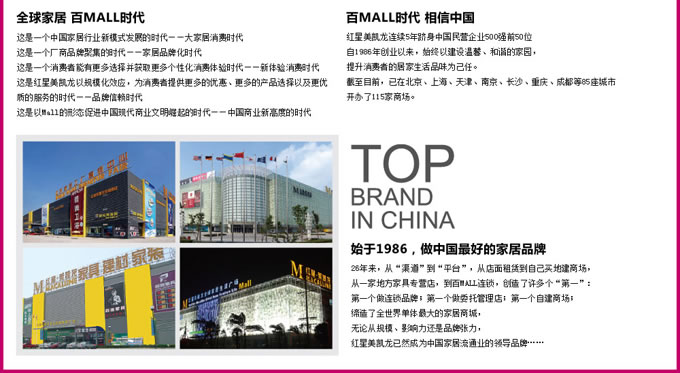 特别是红星美凯龙,经过27年发展,全国商场从第一代升级至第八代商场,红星美凯龙一直持续提升商场的软硬件环境,特别是第八代商场完全按照公园式的环保、休闲、娱乐环境打造,并对50年后及500年后未来之家的逼真模拟。今年4月,公司邀请国际设计大师保罗•安德鲁设计新商场——红星美凯龙家居艺术博览中心,建设艺术性与地标性并重的家居购物广场。