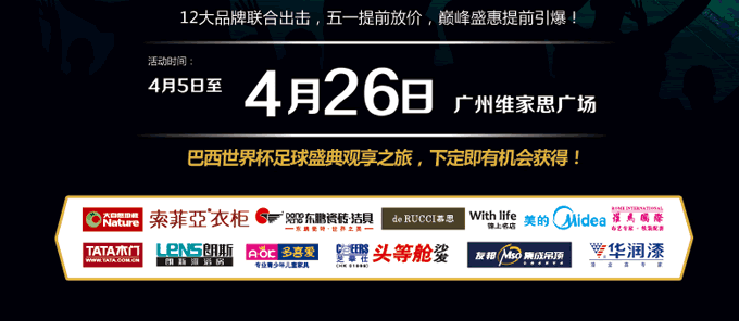 4月26日,大自然地板、索菲亚衣柜、东鹏瓷砖、慕思床垫、锦上名店、美的电器、罗马国际窗帘、TATA木门、朗斯淋浴房、多喜爱儿童家具、芝华士沙发、友邦吊顶和华润漆十二大品牌联合出击,五一提前大放价!全场3折起!今日起报名购买冠军联盟贵宾卡1张即可最高返还1200元,还可 获得价值399元国宾礼品陶瓷刀具一套,还可参与万元大抽奖,4月27网络抽奖,带你去参加世界杯,巴西,GO!现在赶紧填写报名通道报名吧!