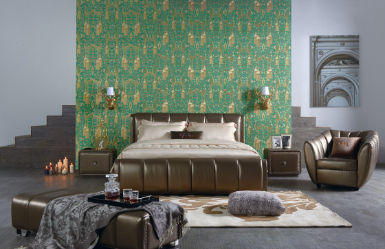 凌然于压力沉重的大城市,回看人生的风起云涌,唯有进入恬静、悠闲、健康的至深处,才能一享真正的奢华之美。阿尔卡莫皮床将庄园情怀融入原始自然的睡眠理念中。舒适宽大的床体,配合宽条纹的柔韧软包,舍弃了装饰过多带来的喧嚣和污染,也寓意着重归清新舒缓的节奏。深重的金属色泽对比整齐的铜钉勾边,在经典的造型中蕴藏着老牌贵族的优雅调性,始终恰当的比例感与对称性则赋予空间不容破坏的高贵秩序,体现出上流社会对优雅宁静家居生活的偏好。