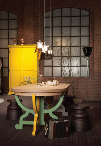 编辑点评:稳妥大地色地面与同色座椅,提升空间稳定度与整体完整性,黄色桌腿与远处黄色小柜呼应,跳脱出大地色的桎梏,给空间以活力感,绿色桌腿则是锦上添花的一笔,梳理空间层次,给整个空间以清新却不单调的感觉,玻璃罩吊灯仿佛后现代作品,提升空间表现力。