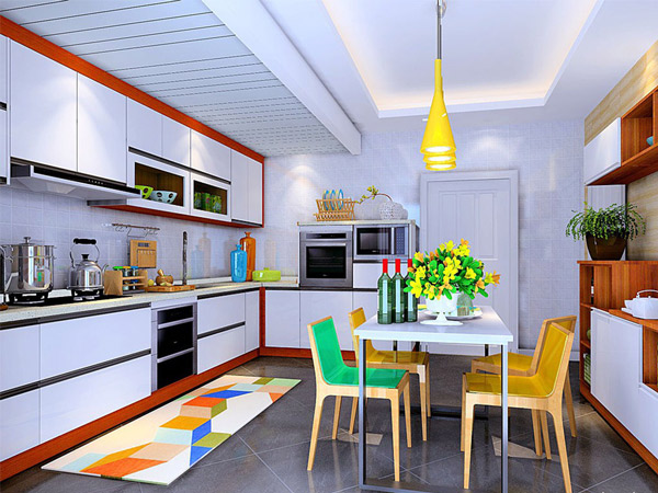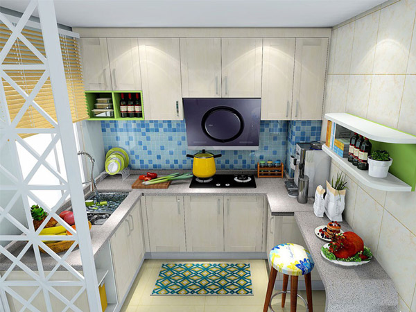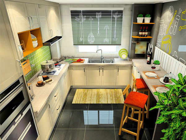 在同一个厨房内,最好采用300mm及350mm两种尺寸(一边墙,一种深度),才能置放大碟,家庭主妇站立时,应垂手可开柜门,举手可伸到吊柜第一格,在这600-1830mm之间的水平空间中,放置常用物品,叫“常用品区”。厨房工作台台面,不可小于900mm×460mm,否则,不够摆放物件。如地方不够,可考虑将微波炉、烤炉等放到高架上,以腾出工作台面。