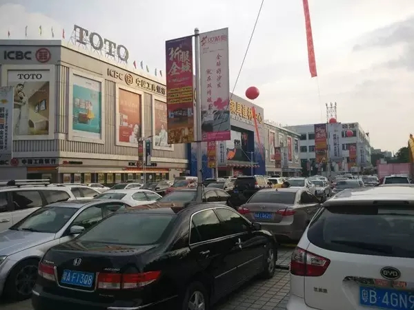 商场外面的停车场挤满了车辆,
