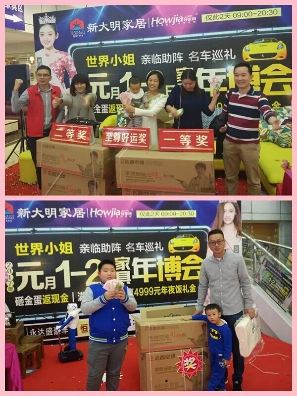 历经一个多月紧锣密鼓筹备的“家具年博会”活动落下帷幕!本次活动是新大明家居2017年第一场大促,来就抽黄金、砸金蛋返现金、满额送家电、赢4999元年夜饭礼金等多重惊喜的豪华大礼,让业主朋友们乐此不疲,收获颇丰!