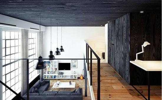 从上层空间往下看,才能看到家中的吊顶设计。深灰色甚至可以说是黑色的木质,一直延伸至天花,黑压压的感觉,却更显个性与摩登。