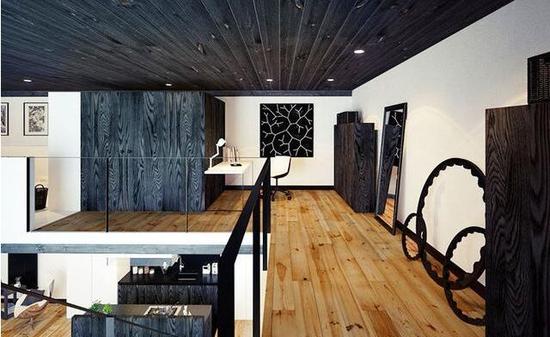 虽是简约风格,而且黑色材质也并非金属,但在看到上层空间装饰物时,你却不得不怀疑自己的眼睛。靠墙的齿轮装饰物,很是别致。