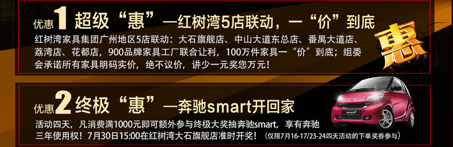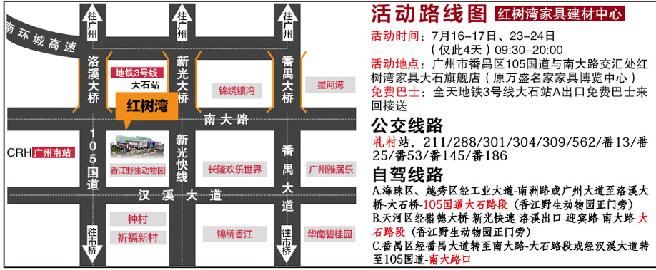 活动地址:广州市番禺区105国道与南大路交汇处红树湾家具大石旗舰店(原万盛名家)