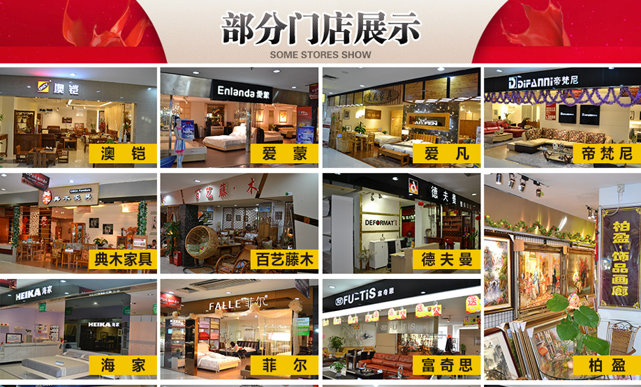 儿童家具:星动时光/七彩空间/虹娇宅配/哈尼贝贝/香榭美松/花样年华  新古典:诗歌 订制衣柜:伊凡仕/德夫曼/索瑞特/沃格 欧美家具:蒙斯顿/千代威尼斯/家美佳 新法式:浪漫佳缘  田园风格:左拉  其他:船说古船木/百艺藤艺/华而美户外/柏盈画廊/佳宝鱼缸/精工地毯/莎蒙拉利/尚品坊/亿佳