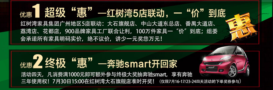 7月16-17日、23-24日红树湾广州首届家博会,疯抢4天,5馆联动,900品牌家具工厂联袂放价,百万件家具逆势抄底!自拍杆、折叠自行车免费送;购物满额,即刻抽取小米平衡车、空调、冰箱等家电,100%中奖;再抽4999元免单大奖,三门冰箱等大奖;另有终极大奖,奔驰smart开回家!壕礼狂砸,气势磅礴,红树湾5店,所向披靡,谁与争锋?活动仅限4天,红树湾家具番禺大道店,蓄势待发,恭候您的光临!