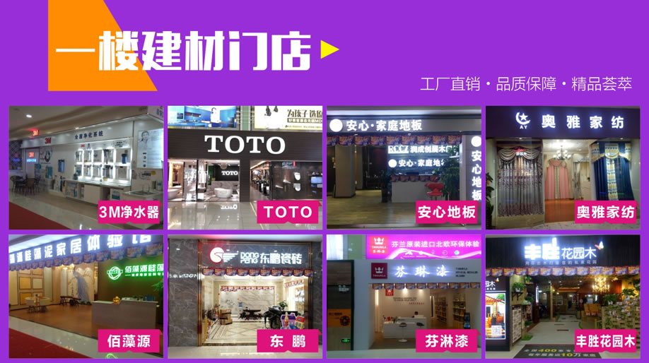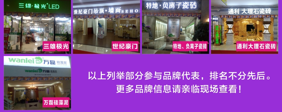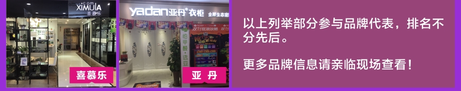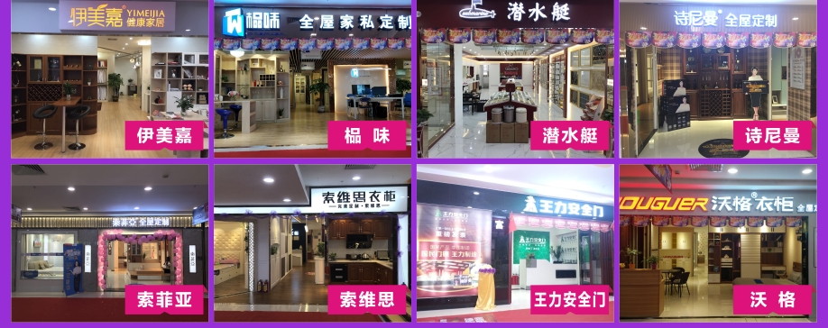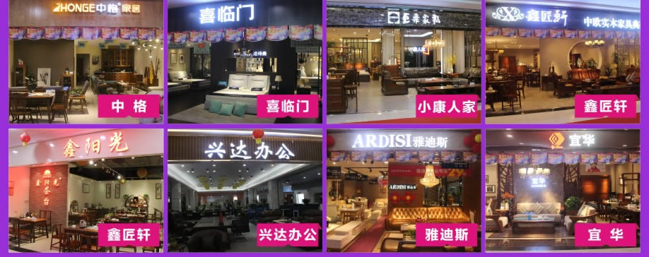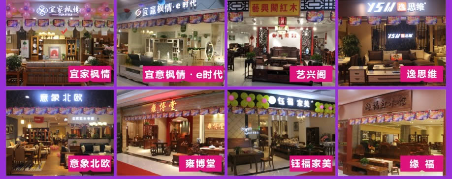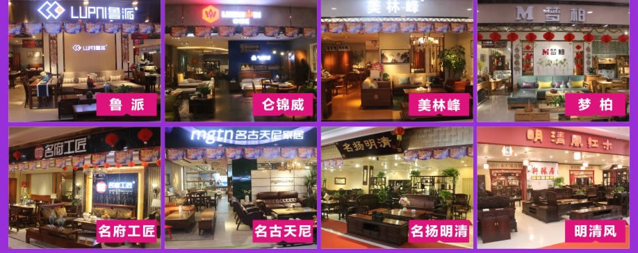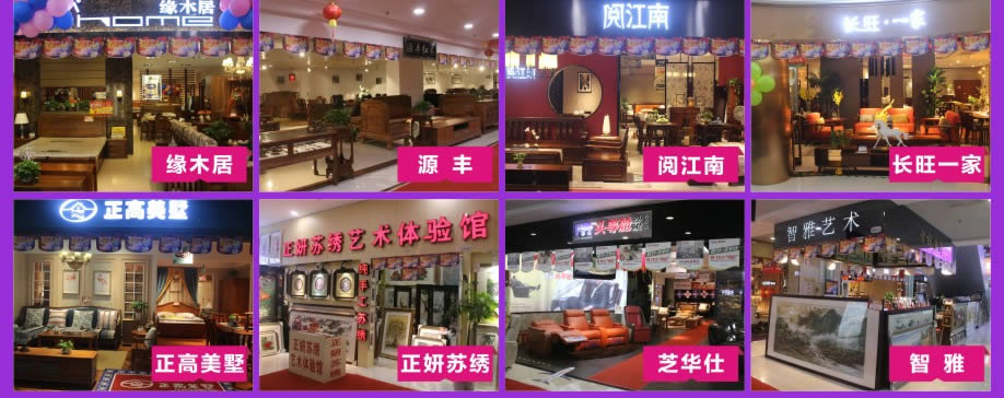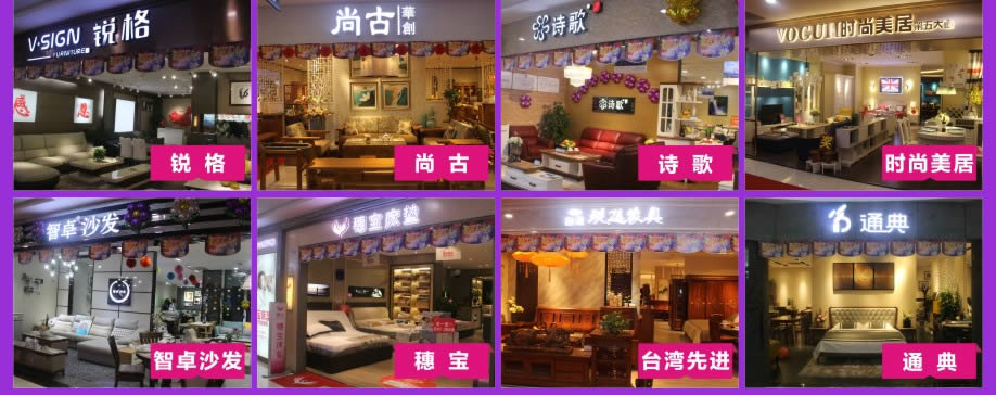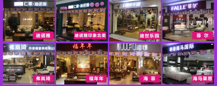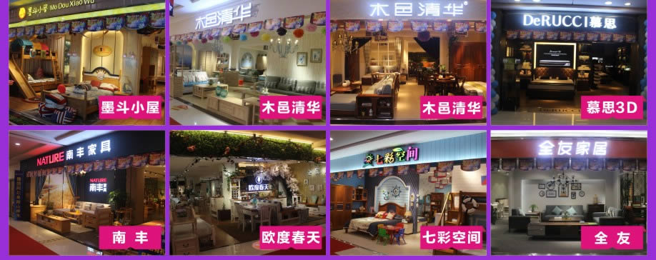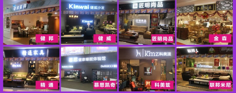 板式板木:时尚美居/简道家/全友/健威/澳玛 现代客厅:弗岚琦/智卓/海马依家/匠明尚品/健威/芝华仕/雅迪斯/联邦米尼/诗歌/名古天尼/富牌/锐格/逸思维 软体睡眠:慕思凯奇/大自然/穗宝/罗图/海马莱思/菲尔/喜临门/慕思3D/海马 实木/板木:意向北欧/长旺/梦柏/宜华/鑫匠轩/美林峰/大唐木业/健邦/中格/宜家枫情/精通家具/木邑清华/仑锦威/阅江南/正高美墅/源创/欧度春天/南丰/缘木居/海菲/鲁派/科美滋/尚古华创/台湾先进/迪诺雅·金柚木/小康人家/迪诺雅·印象北美/木之优/名府工匠/钰福家美/通典 红木套房:名扬明清/和悦古典/汇演红木/红鲤鱼/大森林/华夏一品/金森/雍博堂/福年年/艺兴阁/源丰/百年缅花精品馆/缘福/明清风/鑫阳光/宝林轩/佳林 青少年:迪世乐园/七彩空间/松派城堡/墨斗小屋 欧式/法式:宝居乐/亨利公爵/芭黎玫瑰/仁豪迪诺雅 办公家具:兴达 其它:正妍刺绣/智雅画廊/堂中宝/翠强户外/金富莱鞋柜/精工地毯/顺兴隆