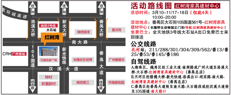 活动地址:广州市番禺区大石街105国道561号红树湾家具建材中心(长隆野生动物园正门旁)