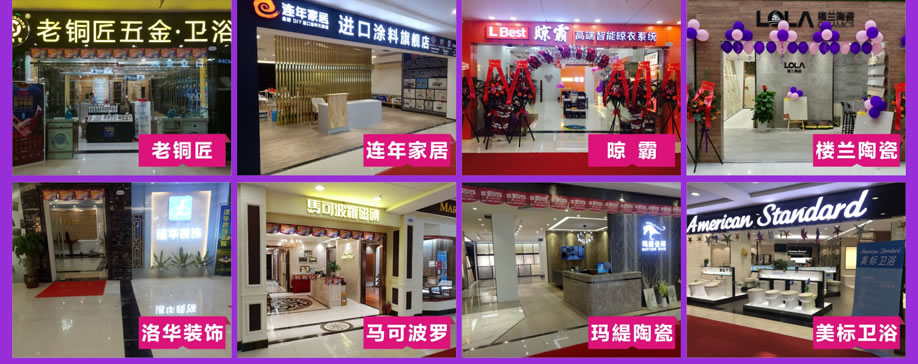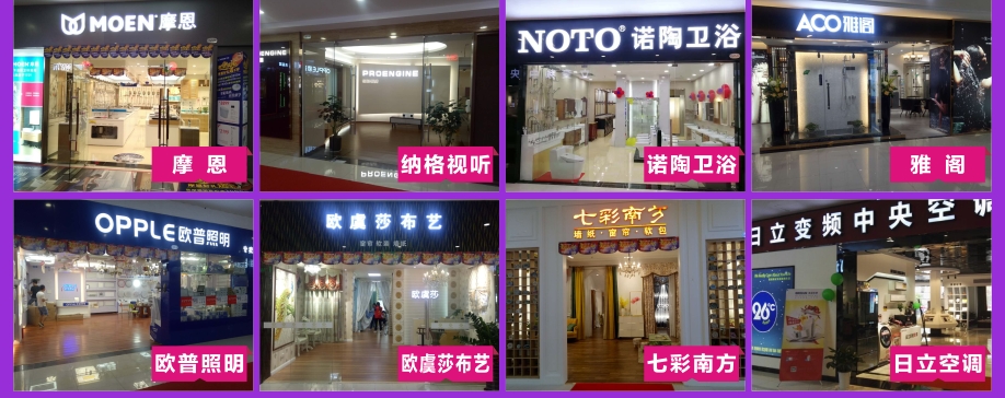 定制:索菲亚/百得胜/佰怡家/好莱客/索维思/帝亚/匠木坊/诗尼曼/德尚尊/亚丹/法博乔登/榀味/城市之窗/芭提雅/沃格/柏林/空间元素/喜幕乐/百年定制/伊美嘉/苹果贵族/优伊居/百年韩太橱柜/植美森实木定制/多睿诗/富安/筑尚名配 木地板:安心地板/嘉森地板/光益地板/卡思摩地板 吊顶:世纪豪门吊顶/奥普吊顶 硅藻泥:佰藻源硅藻泥/蓝天豚硅藻泥/万磊硅藻泥 涂料:芬琳漆/吉纳思意大利艺术涂料/连年家居/卡百利艺术涂料/玛蒂耐特/德麦森 卫浴洁具:TOTO/科勒/美标/华艺/摩恩/雅阁/老铜匠/诺陶 灯饰:欧普照明/欧普水晶灯/三雄极光 窗帘:南方布艺/欧虞沙布艺/奥雅窗帘 陶瓷:通利/特地陶瓷/马可波罗/东鹏/楼兰/玛缇陶瓷 电器:日立/德意电器/老板电器/美的电器/火星人集成灶/松下电气 门窗:汉慕斯门窗/盼盼安全门/王力安全门/环球金门/德通木门/汇时美防盗门/碧玉门窗 其它:纳格影音/洛华背景墙/3M净水器/丰胜花园木/晾霸晾衣架/潜水艇五金