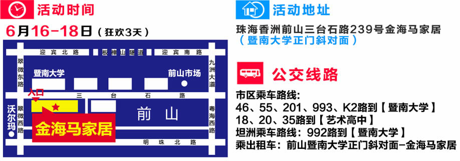 活动地址:珠海香洲前山三台石路239号金海马家居(暨南大学正门斜对面)