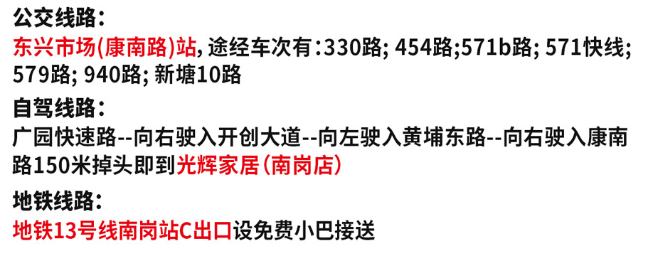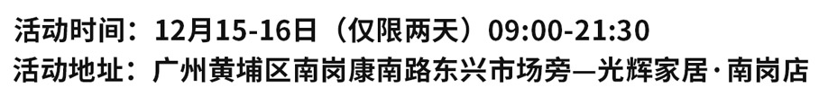 活动地址:广州黄埔区南岗康南路东兴市场旁—光辉家居·南岗店(地铁13号线南岗站C出口设免费小巴巡回接送)